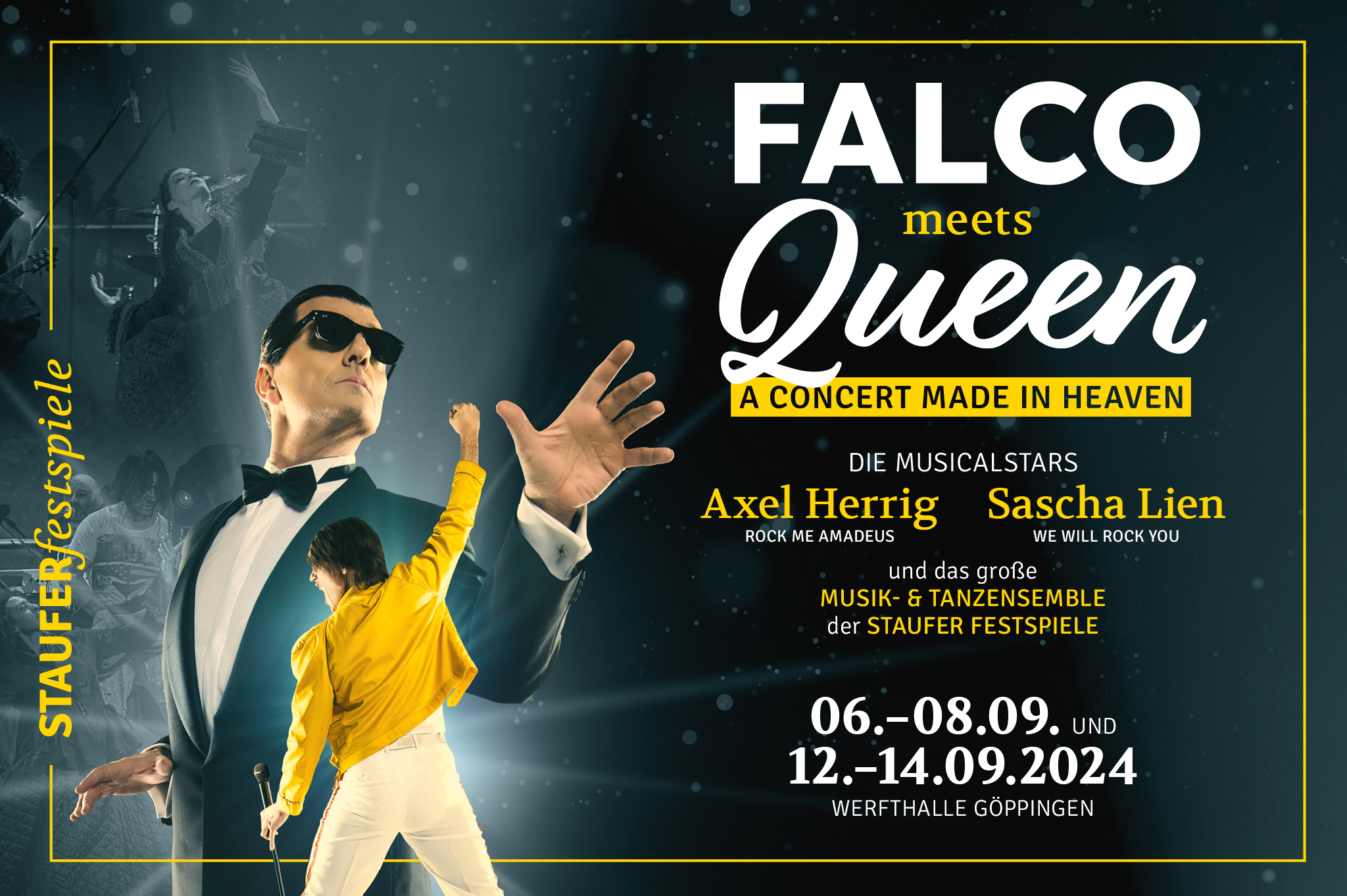 Die beiden Musicalstars Axel Herrig und Sascha Lien lassen zwei Pop-und Rock-Legenden hautnah wieder auferstehen. Falco und Freddie Mercury auf der Bühne vereint – ein Feuerwerk ihrer Greatest Hits: Jeanny, Rock me Amadeus, We will rock, The show must go on u.v.m..